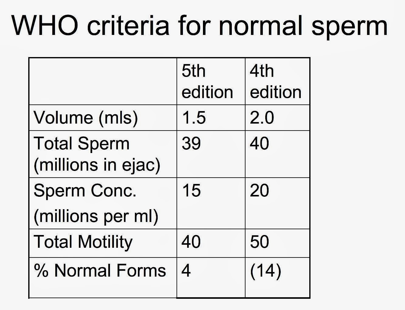 Σας παραθέτω έναν πολύ ενδιαφέροντα πίνακα με τα κριτήρια του Παγκόσμιου Οργανισμού Υγείας (ΠΟΥ) για το φυσιολογικό σπέρμα ..
